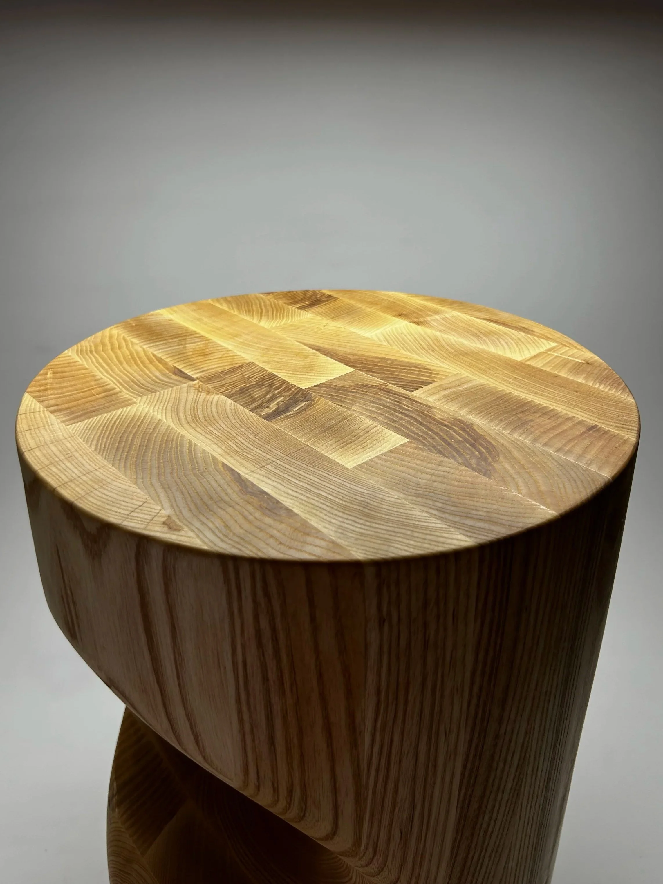The process of creating my stool began with exploring form through sketches. Once I finalized the design, I chose ash for its strength and beautiful grain. Using a stack-lamination technique, I built up the form to create a solid, sculptural base. After turning the stool on the lathe, I refined the surfaces with an angle grinder to achieve a balance between precision and organic texture. Weighing about 35 pounds, the final piece reflects a hands-on exploration of material, craft, and the relationship between structure and form.